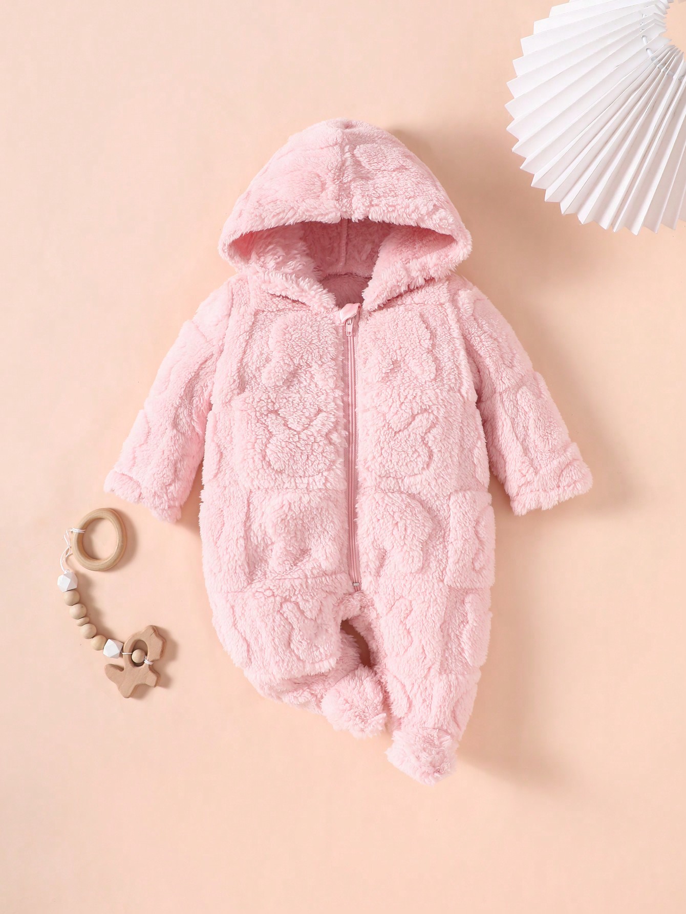 بيجامات رضيع فتاة ذات قدم وكابوشون من الفليس الوردي اللون الصلب